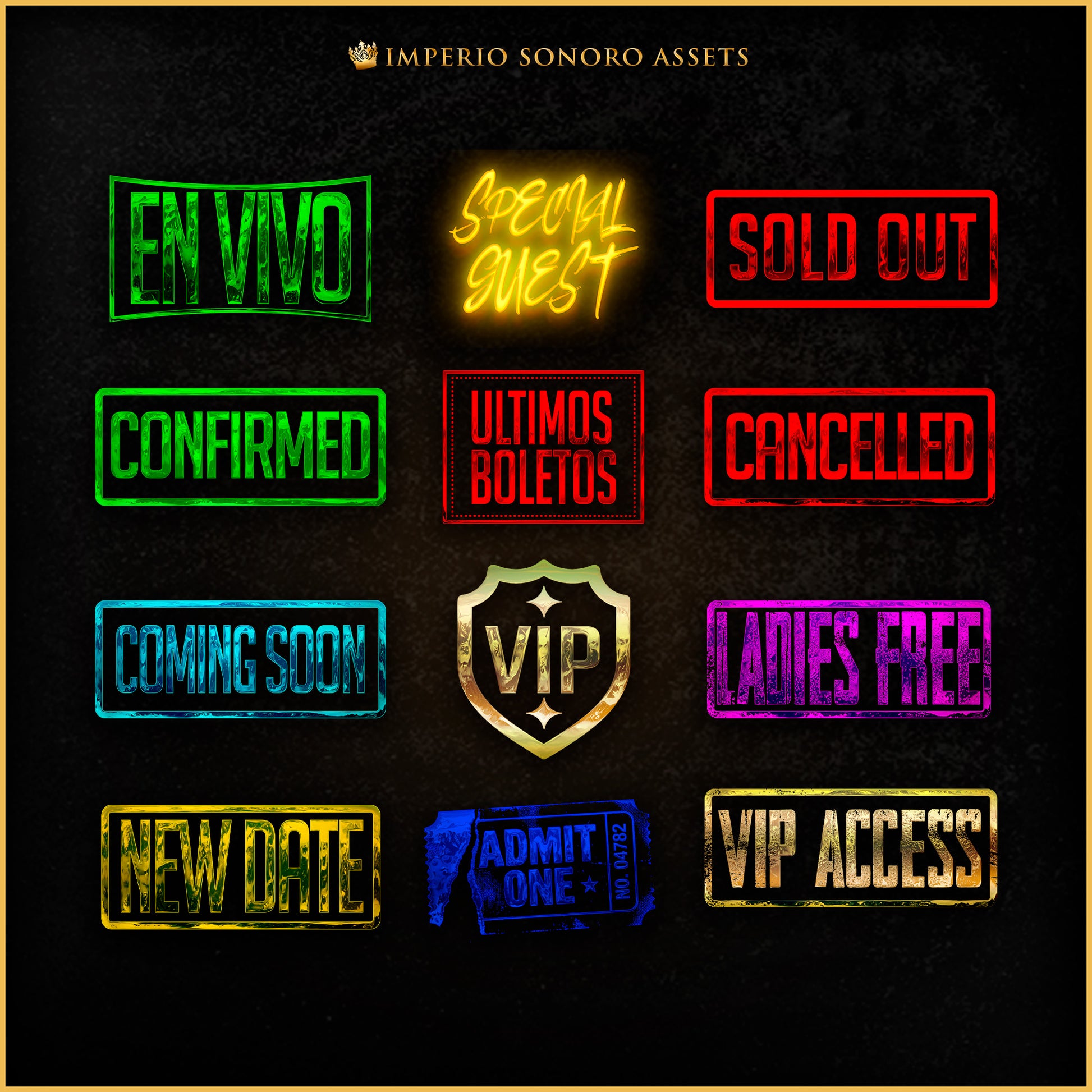 💎 EL TOQUE FINAL DE AUTORIDAD (TOUR STATUS STAMPS) El estándar para comunicar el estatus de tus eventos. Si necesitas informar "Sold Out", "Nueva Fecha" o "Cancelado" sin arruinar el diseño, este pack es la solución visual instantánea.